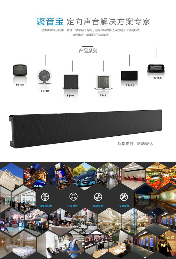 隨著對市場的深入探索,應用領域的開拓也愈發廣泛。截至目前,已成熟應用到文化科博、企業展廳、LED/LCD互動傳媒、汽車、智能交通、商場商超、醫療教育等20多個行業。針對全社會關注的廣場舞擾民問題,聚音寶團隊于今年特推出了”不擾民的廣場舞“全新概念,全傾全力將廣場舞專用有源定向音響從一代升級到二代,更好地服務于人們的日常生活。