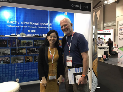 來自香港的toni lin高興地表示,聚音寶可以幫助他們解決商場外面音樂會的噪音問題;日本客戶說道,在廣告行業,聚音寶定向音響大有用武之地;來自美國一家公司的CEO Michael Yap更是現場發出邀約。