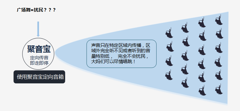 辦法六:使用專門的防干擾音響。使用傳說(shuō)中的”廣場(chǎng)舞神器“——聚音寶定向音響, 這種音響能把聲音集中在一個(gè)特定的區(qū)域內(nèi),在區(qū)域內(nèi)的人能聽(tīng)見(jiàn)聲音,區(qū)域?yàn)閯t聽(tīng)不見(jiàn),或者聲音音量很低。這樣既不會(huì)產(chǎn)生噪音,又不影響舞者積極性,達(dá)到了強(qiáng)身健體不擾民的雙重目的。